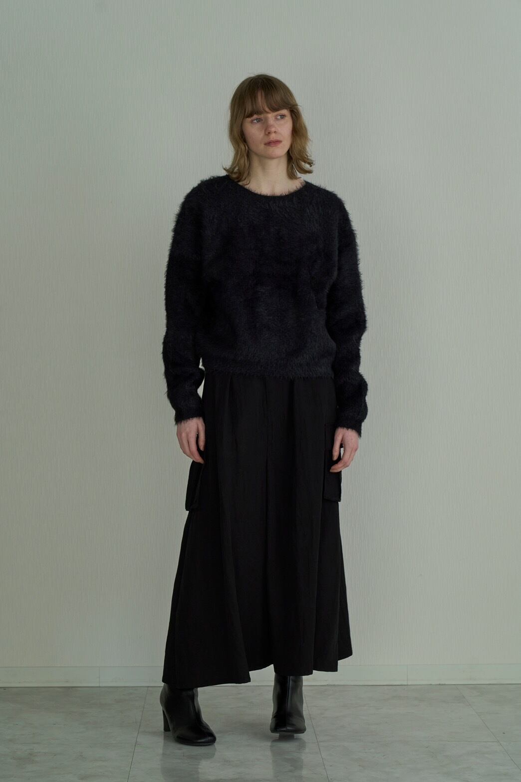 毛足のあるシャギーヤーンを使用し、ふんわりと柔らかな風合いに仕上げたニット素材。表情